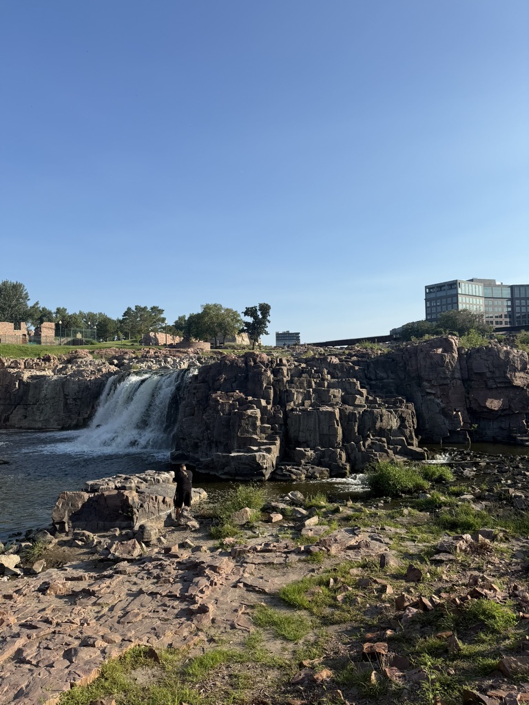 Partenza alle 7:00. Otto ore e venticinque minuti senza pedaggi attraverso il Midwest — piatto in modo che dopo le prime tre ore diventa quasi meditativo. Le aree di sosta praticamente non esistono: ci si ferma ai Walmart. Arriviamo verso le 17:00 e andiamo direttamente al Falls Park: il fiume Big Sioux che precipita su rocce di granito rosso nel mezzo di una città di provincia del South Dakota. Non è spettacolare come quello che verrà dopo, ma è inaspettato — e l’inaspettato in America vale doppio.